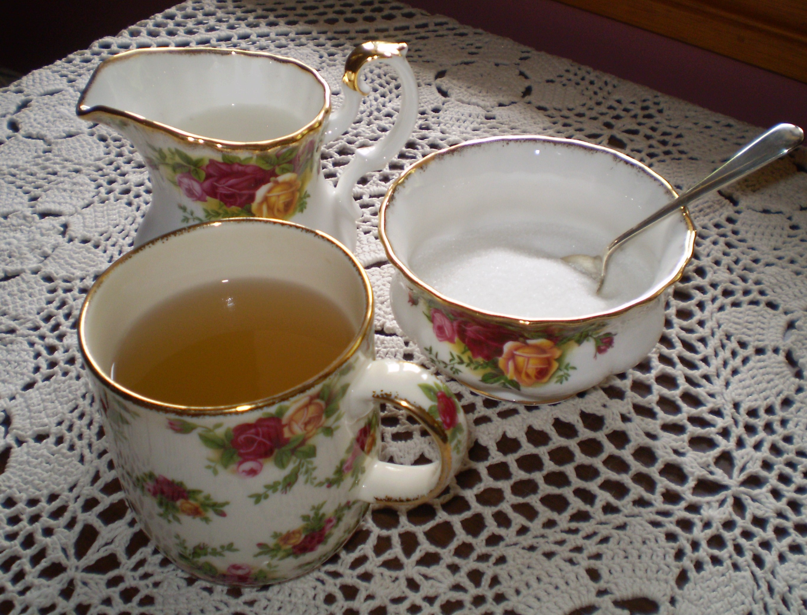 Tea would be poured from a matching tea pot and you would help yourself to milk and sugar, offered also from a matching milk jug and sugar bowl.