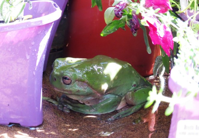 This month has also seen the arrival of some bright green frogs! I really, really enjoy the sound of the croaking frogs when it rains! They live in the rock walls around our house and I love catching a glimpse of them every once in a while. They are rather shy creatures though. I think this one that I found, sitting among my new plants, must have been a grandfather frog! He was one big froggy!!