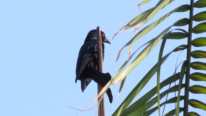 One of the birds, a Spangled Drongo, has tail feathers which look like a fishes tail! He seemed to be alone when I spotted him, dangling from an unopened palm leaf.