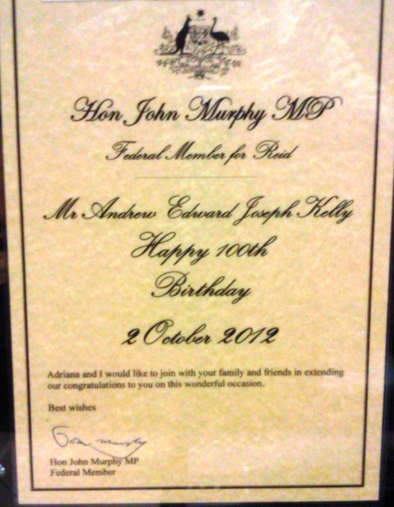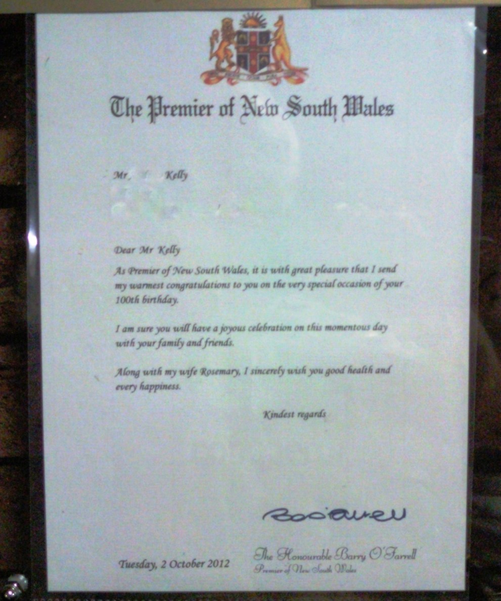 What Joe did received was a letter from the Queen, and the Governor General, the Prime Minister, the State Premier, the Federal Member of Parliament and the Local Member also!