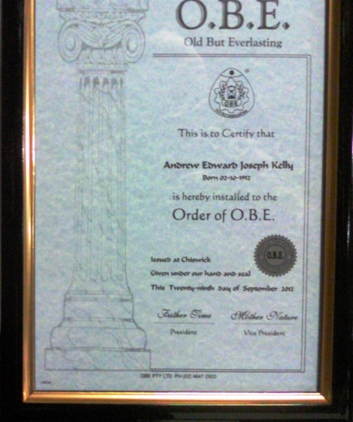 He even received an O.B.E! ~ Old But Everlasting, signed by Father Time and Mother Nature….how wonderful!