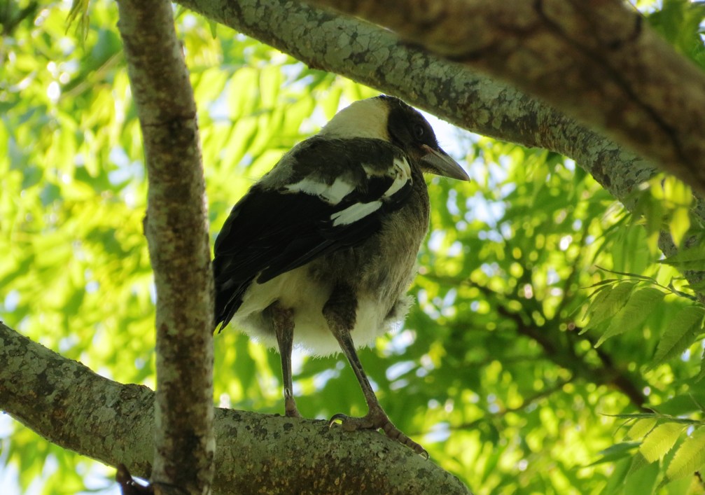Whilst sitting in my work room, with window wide open, the welcoming sounds of the chirping of baby birds has filled my ears! Through years of practice I have learnt the art of “selective hearing”, allowing the outdoor sounds of nature to have a higher volume than my machines. A few days ago two baby “Noisy Miners” came along for a visit with Mama Miner and yesterday I was thrilled to bits to finally see a baby Magpie, whose tiny chirps I had heard for a few days.