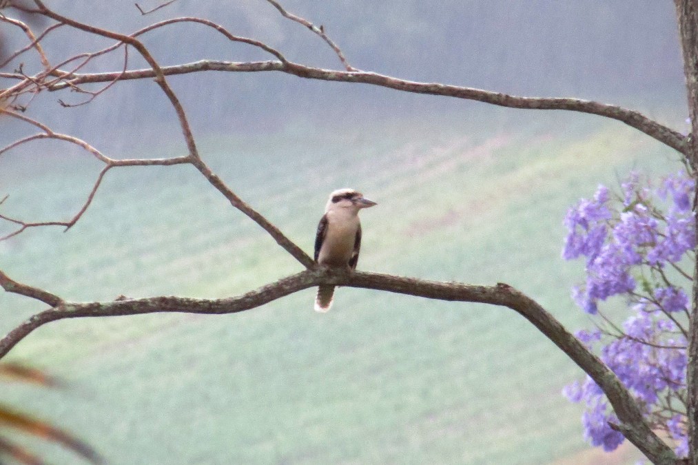 In the next photo you can see a placid kookaburra enjoying a quiet moment in the morning mist. The purple tree beside him is a Jacaranda, a beautiful tree which puts on a brilliant show in the late spring in our area.