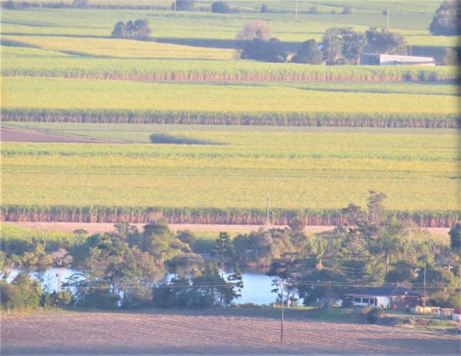 The second photo was taken with my camera on full zoom. The water is a section of the Tweed River, and growing beside the river – and beyond – is acre upon acre of sugar cane fields.