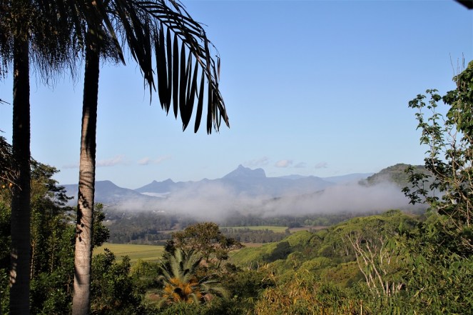 At 6:30 am today, the mist was so thick it had blocked the view of everything beyond the palm trees in my garden. And the mist appearing after another warmish night convinces me that what I am seeing must be some form of condensation vapours rising from the damp earth. I had to wait for almost an hour before the mist had cleared enough to take photos of the valley. By that time, the sun had risen, casting shadows across the large stems of the palms, yet the flimsy, misty clouds continued their dance below the mountain.