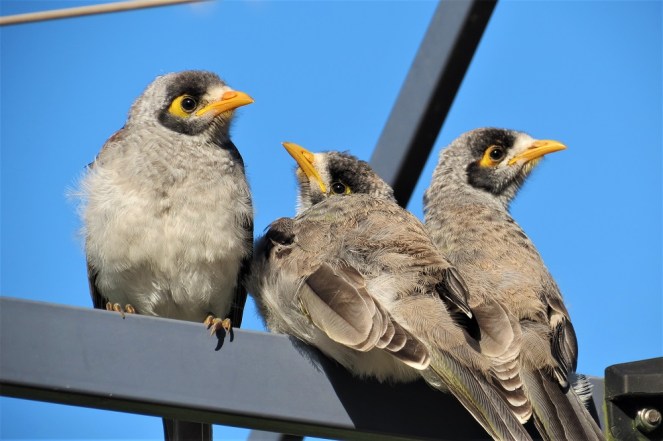This morning there seemed to be several Noisy Miner birds in our back garden, causing a bit of a hullabaloo, so I went outside to investigate. Sitting on my clothesline, all cuddled up together, I discovered three gorgeous, fluffy, baby miners. They didn’t seem to mind me going right up close to them to take a photo either, so perhaps the adults, in whatever way they communicate, let the babies know they were in a safe garden. I still see the baby magpie in the tall gum tree out the front, but so far it hasn’t ventured into the back garden. I’m assuming it just isn’t old enough, or strong enough, to fly too far yet.