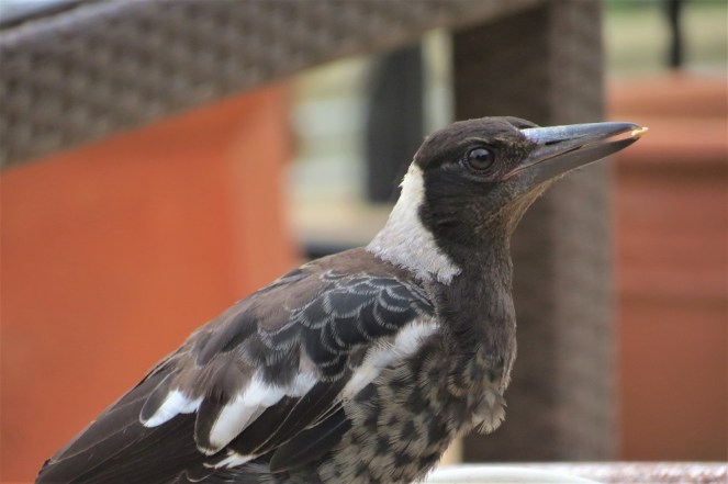 Later, baby magpie visited. The rain was light but consistent, and by the looks of the baby’s dry feathers, I think he may have hidden himself away amid tree foliage to escape the unfamiliar (to him) sight of rain –