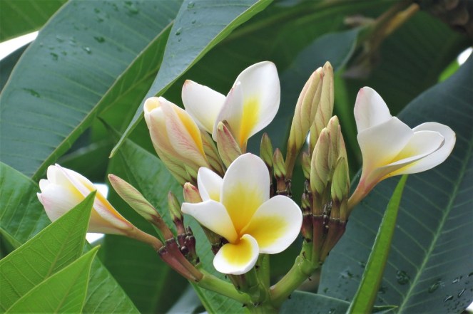 Exhibit C – My yellow and white frangipani, growing close enough to the house to allow me to take a photo without going out into the rain, with tiny beads of moisture captured on the leaves –