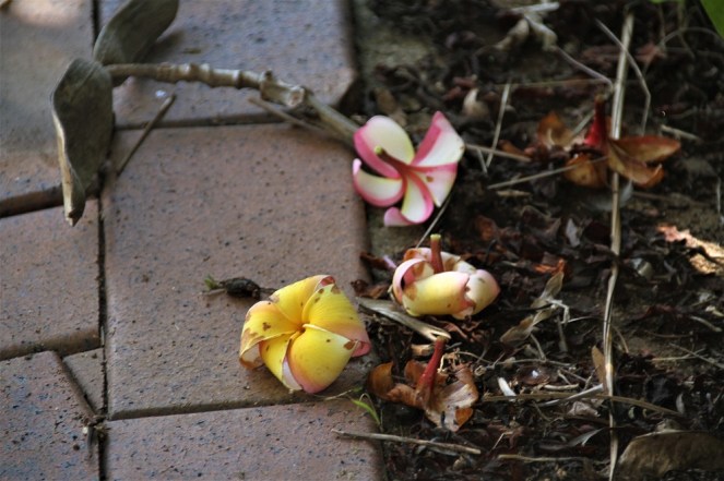 This is the eastern end, an area more exposed to the elements. Here I found unidentifiable dried debris, littered with fallen frangipani flowers, and even a small branch broken off the frangipani tree. This discovery led me to wondering if I will see a second burst of flowers blooming on the frangipani before the cooler weather arrives, seeing as the tree lost most of its flowers during the recent powerful gusty winds we had? So many questions …