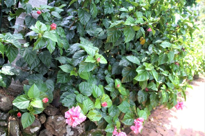 I must document these changes I see in my garden, for future reference. I noticed today that the western end of the hibiscus hedge still has a few unblemished flowers left. It is also on the western end – an area protected by a solid fence nearby – where more new buds are growing.