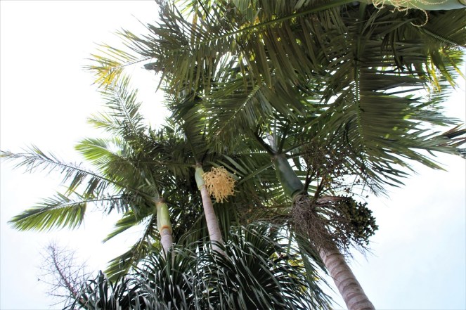 My photos often feature the palm trees we planted many years ago as tiny saplings. Now their massive leaves tower above me when I stand beside the hibiscus hedge. I couldn’t tell anyone what variety of palms they are. I can safely say, however, that when the palms grow seeds, I see birds stopping by briefly each day to check the seeds. I assume the birds are waiting for the seeds to ripen, because eventually I see flocks of birds excitedly clamouring over one another, hopping from bunch to bunch, until they find seeds to their taste.
