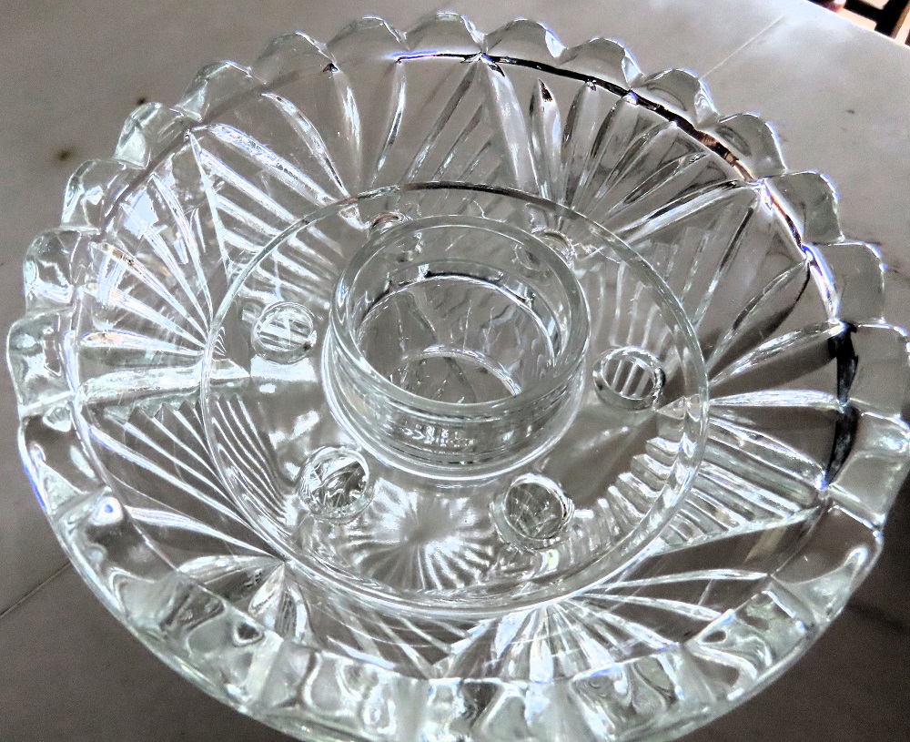I chose my oldest crystal vase to arrange the display in an upright position. The centre of the vase can be removed, but I prefer to leave it in place when displaying tall flowers, such as the agapanthus, to give them stability. This vase is a particular favourite, inherited from my mother. It is about as old as me and a vase that I treasure.