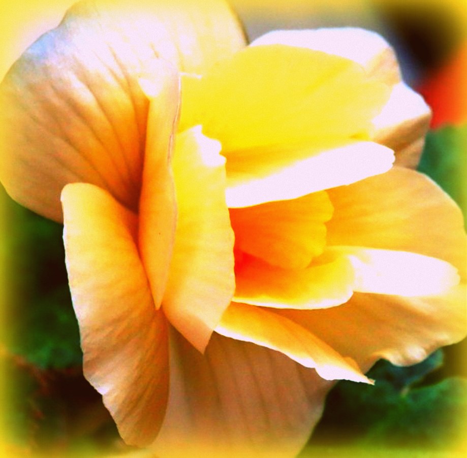 My Begonia sits in a pot on the front veranda, and amazes me every year, as I watch the brown soil shoot new green growth into the world…and further, produce the most brilliant flowers!