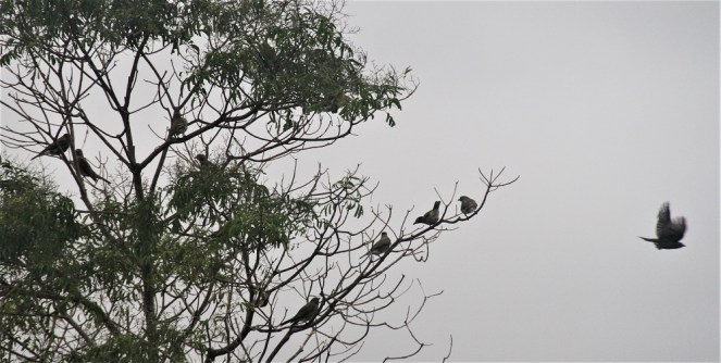 In the distance, I spotted a tree containing many beautiful song birds. When I magnified the photo, I was able to identify the birds as both male and female Figbirds.