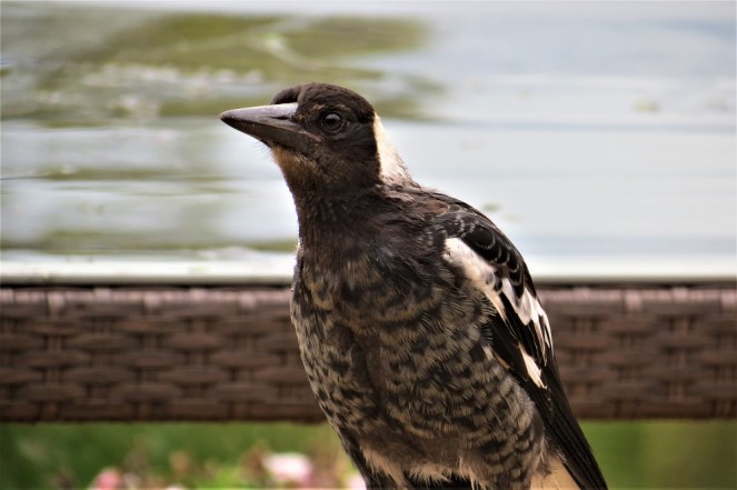 The photos in today’s post were taken about two weeks ago. It had been raining, and between showers I went outside to take a few photos. Baby magpie saw me, so followed me as I walked around the garden. When I stopped to take photos, he perched nearby and waited. When I moved on, he followed me. Like all the other generations of magpies before him, baby magpie enjoys my company. And I enjoy his company. It’s as simple as that.