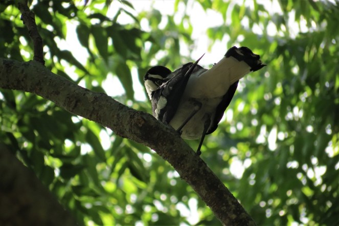 During the afternoon I heard a commotion out in the front garden. Noisy Miner birds – who are named “noisy” for a reason! – were kicking up a ruckus in the tree at the top of our garden, their squawks intermittently interrupted by the sound of a distressed Magpie.