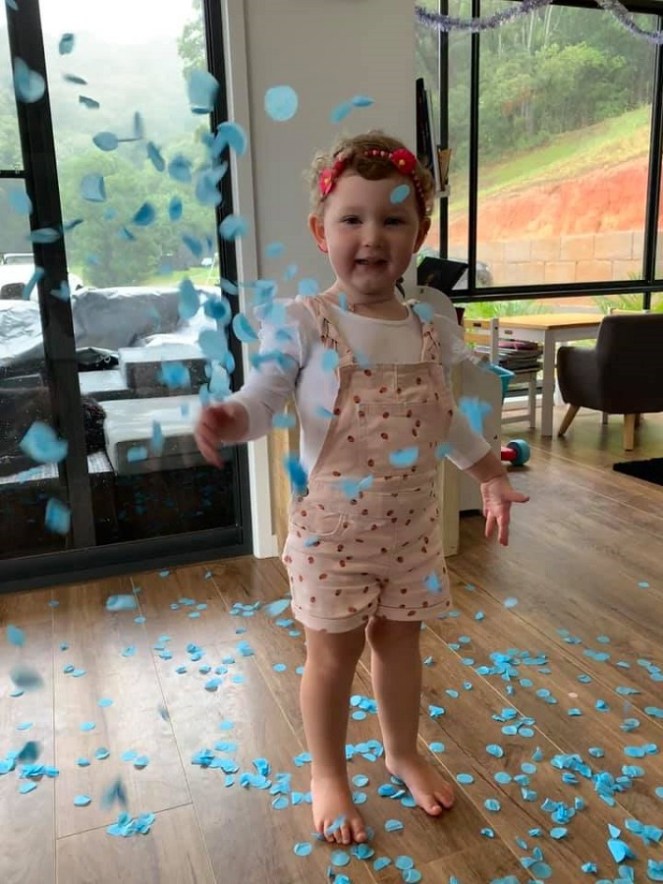 Aurora, who is to be a big sister, was pretty excited about popping the balloon ~~ Mummy and Daddy were excited to see what colour confetti was in the balloon ~~