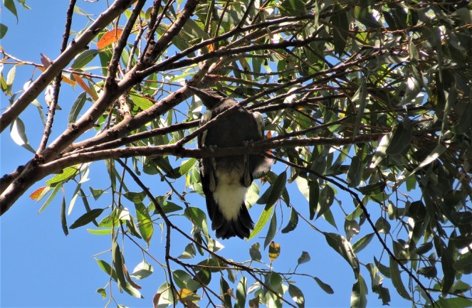 For the past couple of days I have been hearing the cheeping of a baby bird. Up until today I haven’t sighted it, but today, I did. Mama magpie spent the day either searching for food, or sitting on the branch high up in my Lemon Scented Gum Tree next to her fledgling. I took some photos, and this is the best I could get.