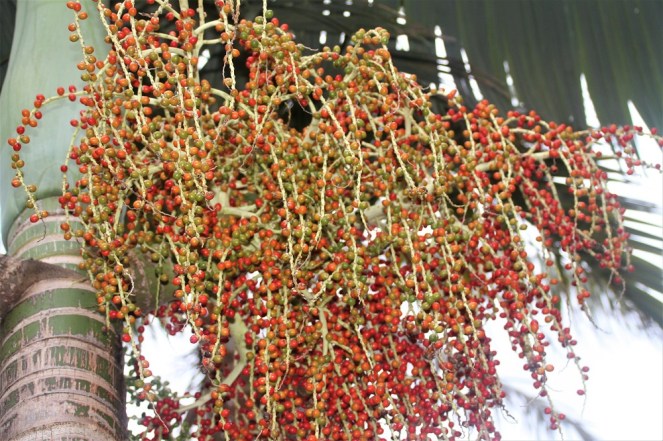 The Figbirds often sit atop these bunches of palm tree berries and I’ve often taken photos of them, from a distance, munching away on them. They were too busy with my mulberries today and seemed to have forgotten the berries, so I got a much closer photo of them on my way back to the house.