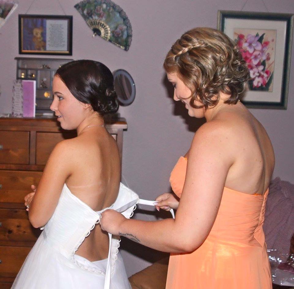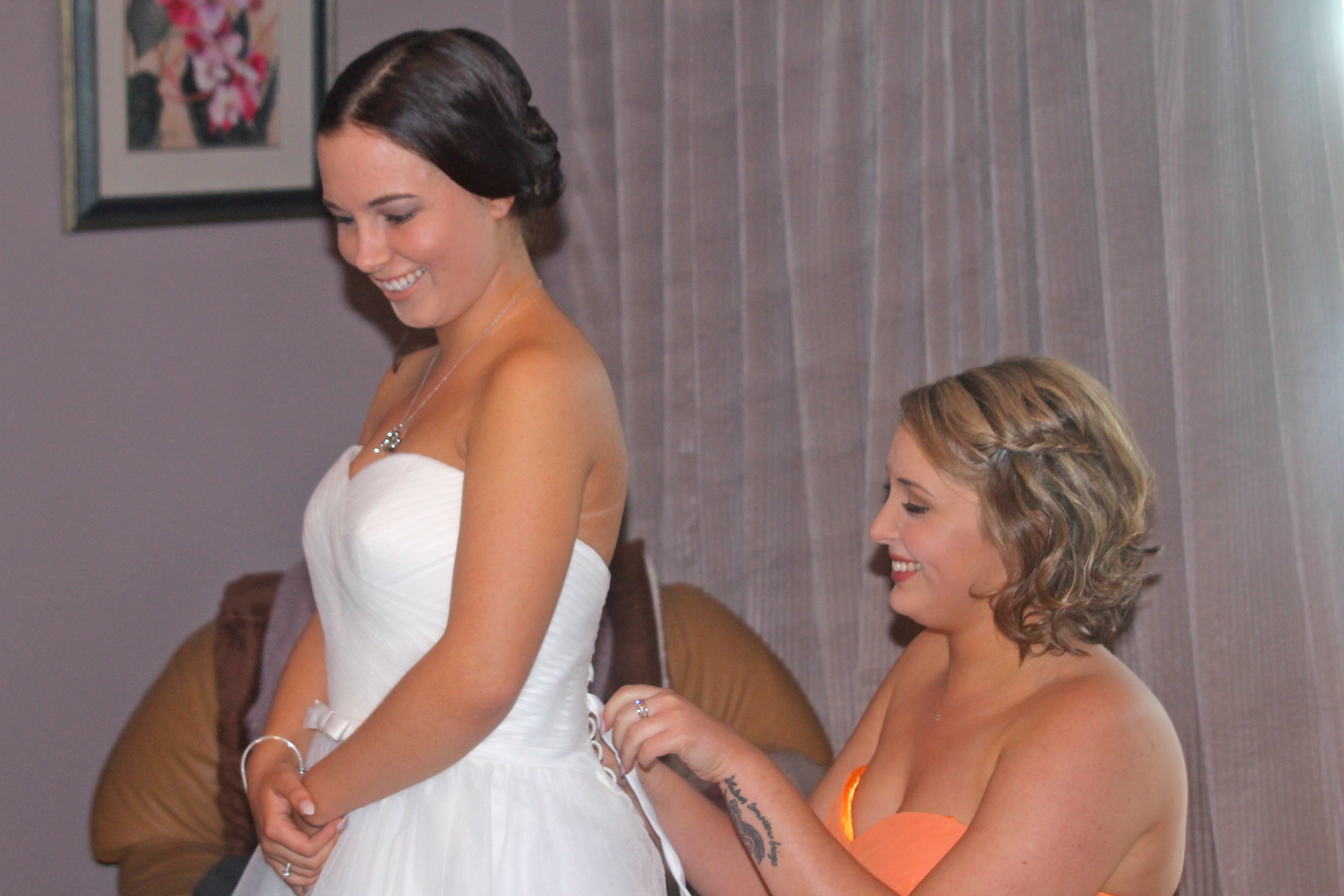 Just a little bit of help was needed with Mary’s stunning wedding dress though, so Emma did a wonderful impersonation of a woman from the 1800’s, looping the length of thin fabric through the loops at the back of the dress and pulling it tightly together.