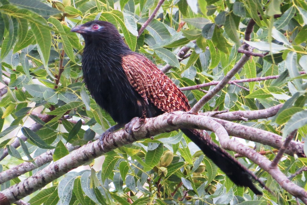 Occasionally, I spot a Coucal, usually way down the back yard (we have one acre of land), or taking off in their laborious way, disappearing into the trees. Unfortunately, due to their inability to fly easily, we often see them on the main road leading to our village, victims of the cars moving faster than the coucals can fly across the road. They also walk a lot, another hazard for these beautiful creatures.