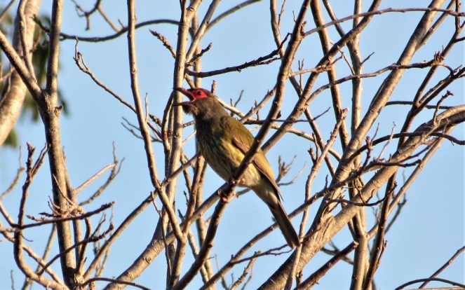 All of my figbird photos are taken from a distance. They are very shy birds who don’t get too close to people. This photo is as much about the tree as the bird, it’s my pecan nut tree, and the branches are showing signs of new growth. That means I won’t see the birds on the branches for too much longer, at least until the tree loses its leaves again next winter.