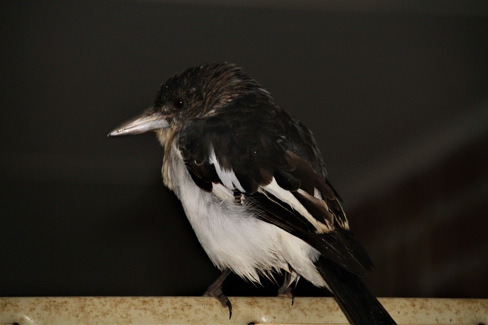 I had a sweet baby butcher bird hiding from the dismal day on my back veranda for a while too. Unfortunately, with the light of the day so dark, little butch blends in a bit. Luckily his white feathers allow him to stand out slightly against the dark background. 🙂