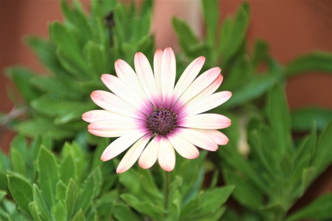 The daisies are beginning to flower again now. I have two plants of this gorgeous deep salmon-orange colour, and these two are the first on one of the plants. Before long, I will have enough daisies in bloom to fill a whole vase. 🙂 And on the right is a purple salvia.
