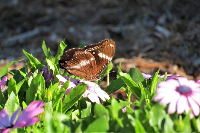 Going back to my garden, the first photo shows the Tibouchina tree. The second photo shows the bird bath, which is often used, and an assortment of mostly potted plants, waiting for the heat to diminish so they can be planted in the ground. Some plants live here permanently, such as a Hydrangea, Dianthus, Gardenia, Daisies, and two potted Spathiphyllum, or Peace Lilies. The Spathiphyllum are happy enough indoors, but I find they flower nearly all year ’round when they live outdoors in the dappled shade under the Tibouchina tree.
