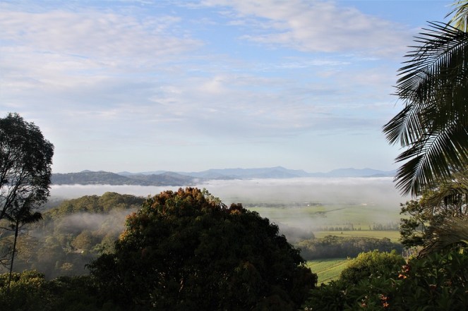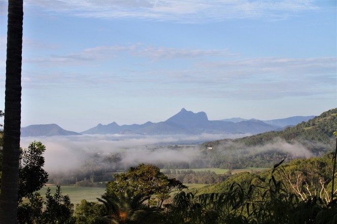 Lately, with all the rain and blustery weather we have had, there have been several mornings when the mountain hasn’t been visible at all, so I really appreciate the fine-weather mornings. The current La Niña weather pattern has sent parts of my garden into a tizz, with all the small green mango fruit blowing off the tree before it had a chance to mature, and we hardly have any frangipani flowers left. Only those flowers hidden among the leaves on the safer, northern side of the tree have survived.