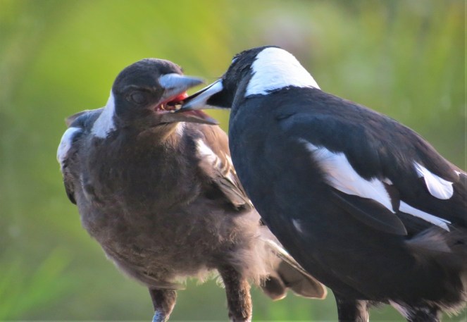 This afternoon I had a sweet little visitor again. Daddy magpie turned up with baby mags, and they both got stuck into the bird seed I had left out for the honeyeaters. They seemed to enjoy it too.