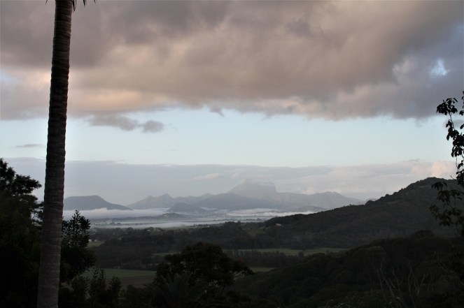 The sky had the slightest tinge of pink early this morning, (although it doesn’t show up in the photo) and as the day progressed and the low cloud cleared, Mount Warning stood beautiful and clear in all her blue-green glory. I must be growing used to seeing clouds over the mountain though, as I chose this photo over clearer sky photos I took later in the day due to the character clouds add to the early morning sky.