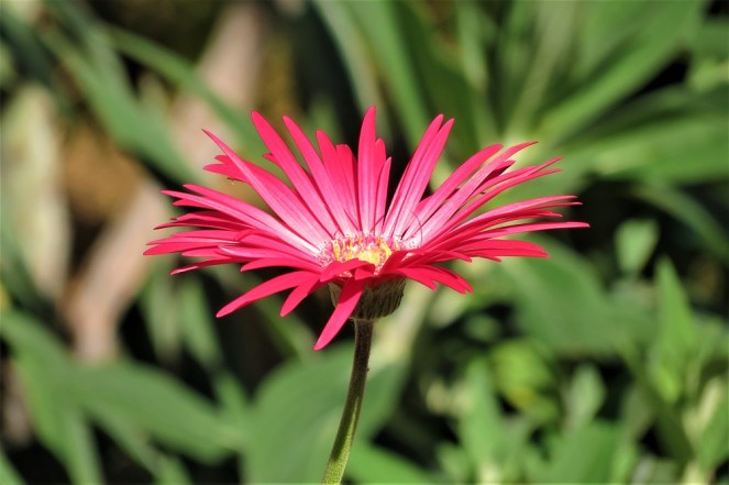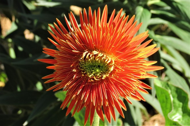 This orange gerbera, while not as finely featured as its neighbours in the garden, is an extremely striking plant. Visitors often comment on how lovely it looks.