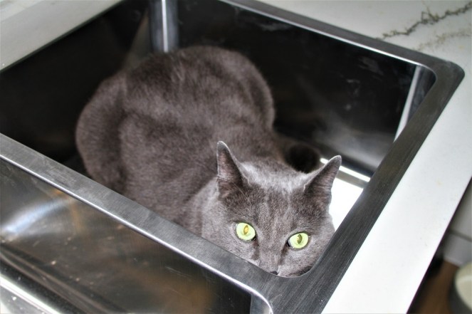 The kitchen renovation is scheduled to be finished by the end of this week. Tomorrow, the plumber arrives to restore water to my kitchen. Meanwhile, Bowie needed to investigate the new kitchen sink, as I knew he would. 😉