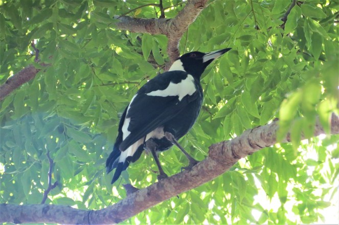 We occasionally see Magpie Larks in the garden, and I have noticed recently we have one dropping into the back garden each morning after the other birds have finished eating the food I give them. Magpie Larks are another native Australian bird, affectionately known as Pee Wees. They have a very pretty song and seem completely harmless, so goodness knows why the magpies objected so much to the visit. Maybe the magpie family feel that they “own” my yard, and the tree being in our yard belongs to them.