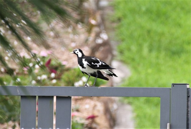 Joining me to enjoy the early morning view from the tibouchina tree was my little Butcher Bird friend, Hoppy (of gammy leg fame) …