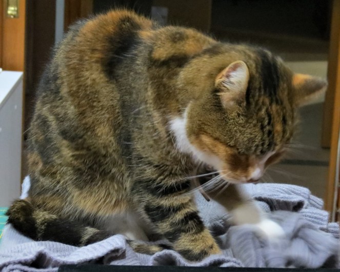 I have spent most of today indoors, sorting through masses of papers which have littered my desk for the past three months while I have been engrosed in uni study and assignments. I plonked a grey blanket on top of my sewing table a few weeks ago, and Miss Tibbs seems so happy with it being there that I haven’t had the heart to move it. Now, she sleeps on the blanket, and when she’s not sleeping she’s kneading the blanket! That’s why one of her paws is blurred in the photo – up and down her little paws went, kneading away as happy as could be.