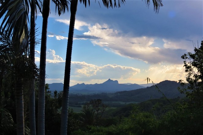 About a week ago we had a couple of days when storms and blustering winds hit us each afternoon. We even lost power Saturday before last. During the chaotic weather, our palm trees took a bit of a battering, and since then we have lost a few of the lower leaves. Where once I had palm leaves dancing in the foreground as I took photos of the mountain, now all I have are tall, bare palm trunks. The leaves are still growing in the lofty heights of the tree, they just don’t appear in my photos any more.