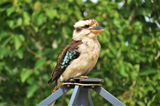 When I saw this beautiful boy atop my clothesline this morning I first took a photo from afar. Until I approach a kookaburra, I am never sure whether they are tame or shy. Kookaburras with both characteristics visit my garden these days.