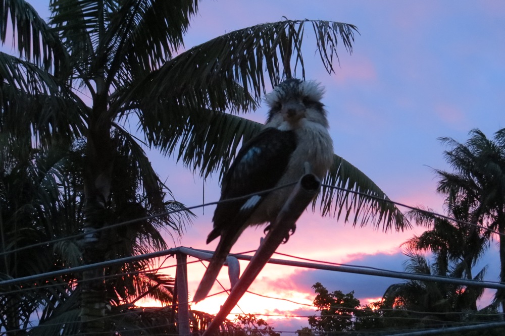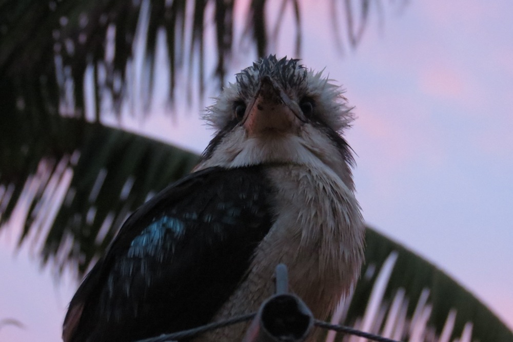 One poor, wet, bedraggled kookaburra. This is my very tame friend, who I have named Larry, due to his Three Stooges hairdo!