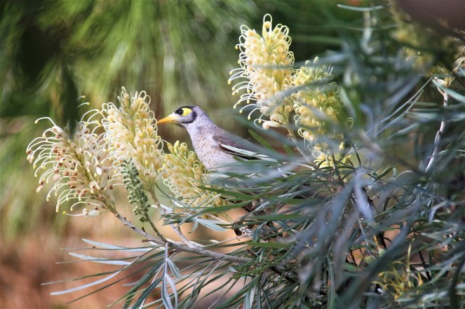 Today I am sharing two of my favourite Grevillea photos. Our Grevillea is a small native tree that we planted about 26 years ago, and every year, without fail, we have a mass of beautiful nectar-filled, pale yellow flowers emerging like delicate spiders legs. Our native birds love the Grevillea tree, especially Noisy Miners, with their yellow beaks and eyes. Don’t they colour-coordinate beautifully with the flowers?