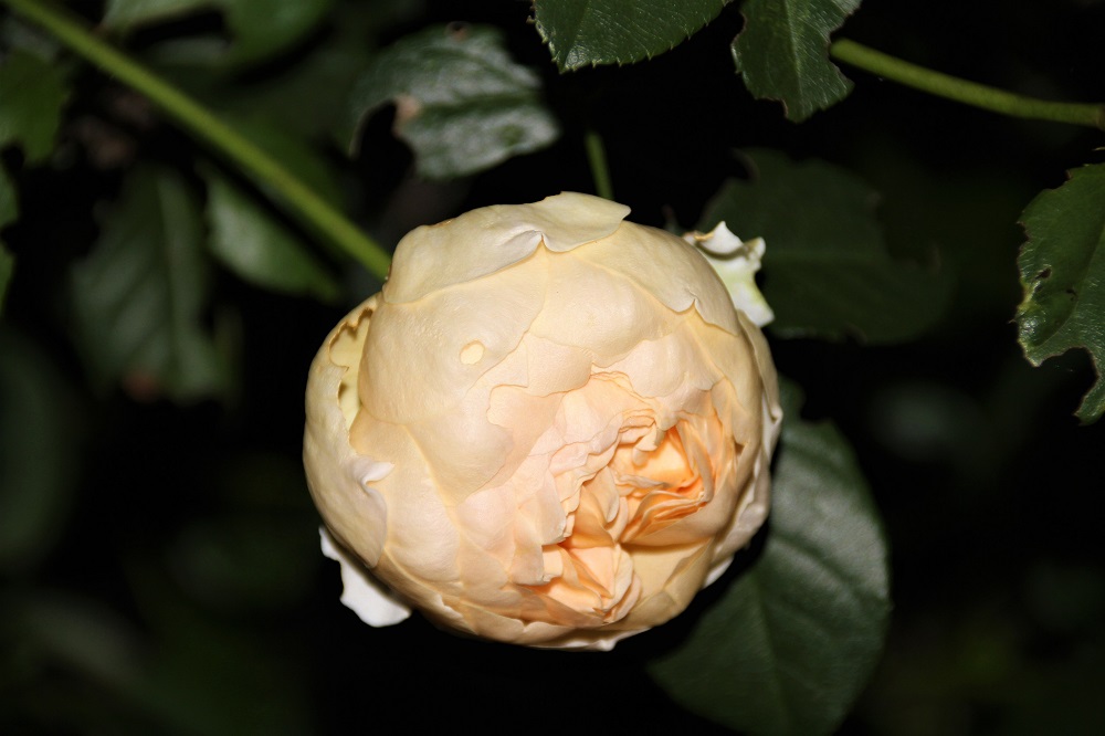 I will keep an eye on this beautiful “Jude the Obscure” rose over the next couple of days as the petals unfold. It looks like the green grasshoppers I have seen on some of my plants this year may have enjoyed a tiny nibble of the pretty petals, but hopefully its just the outside petals that they munched on.