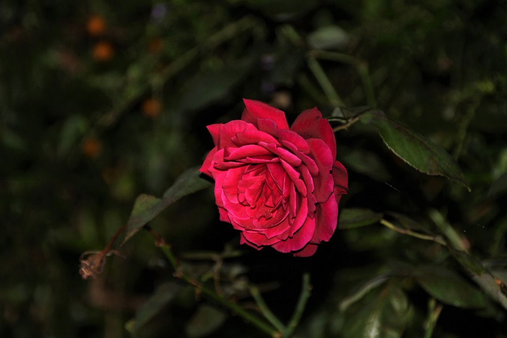 Late yesterday afternoon I took a few photos around the garden, and I love this deep red rose against the darkening backdrop of the garden. Red can be an “iffy” flower colour to photograph with the photo often looking over-exposed. The darkness of the day yesterday seems to have helped me achieve a true-to-colour photo this time.