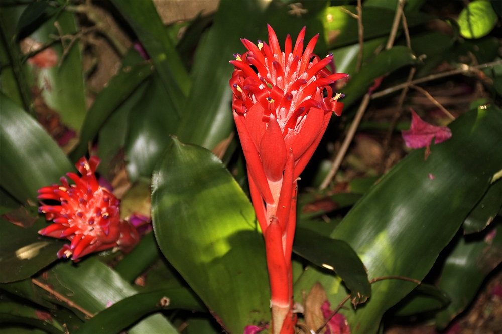 The first three photos are plants in my front garden. The last is the beginning of a flower that will open more fully over the next few days. I think, from memory, the plant is a bromeliad. It’s a shade-loving plant that my son-in-law planted about ten years ago. Back then, he stuck a shabby, dry plant in the ground, and a couple of days later he told me it was probably dead and he’d just take it out. I persuaded him to leave it, assuring him that I’d keep an eye on the plant, and if it didn’t show any signs of life, I’d get rid of it. As you can see, the plant thrived, and every year it produces these rather eye-catching flowers.