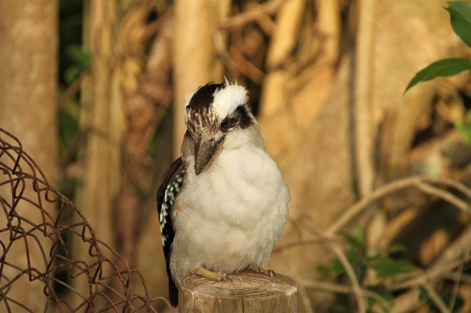 During the past week I’ve heard a few squabbles among the kookaburras and this morning they were fighting for top position on the clothesline! They are such funny characters and as you can see, this kookie is acting quite indignant over being challenged to his top spot!
